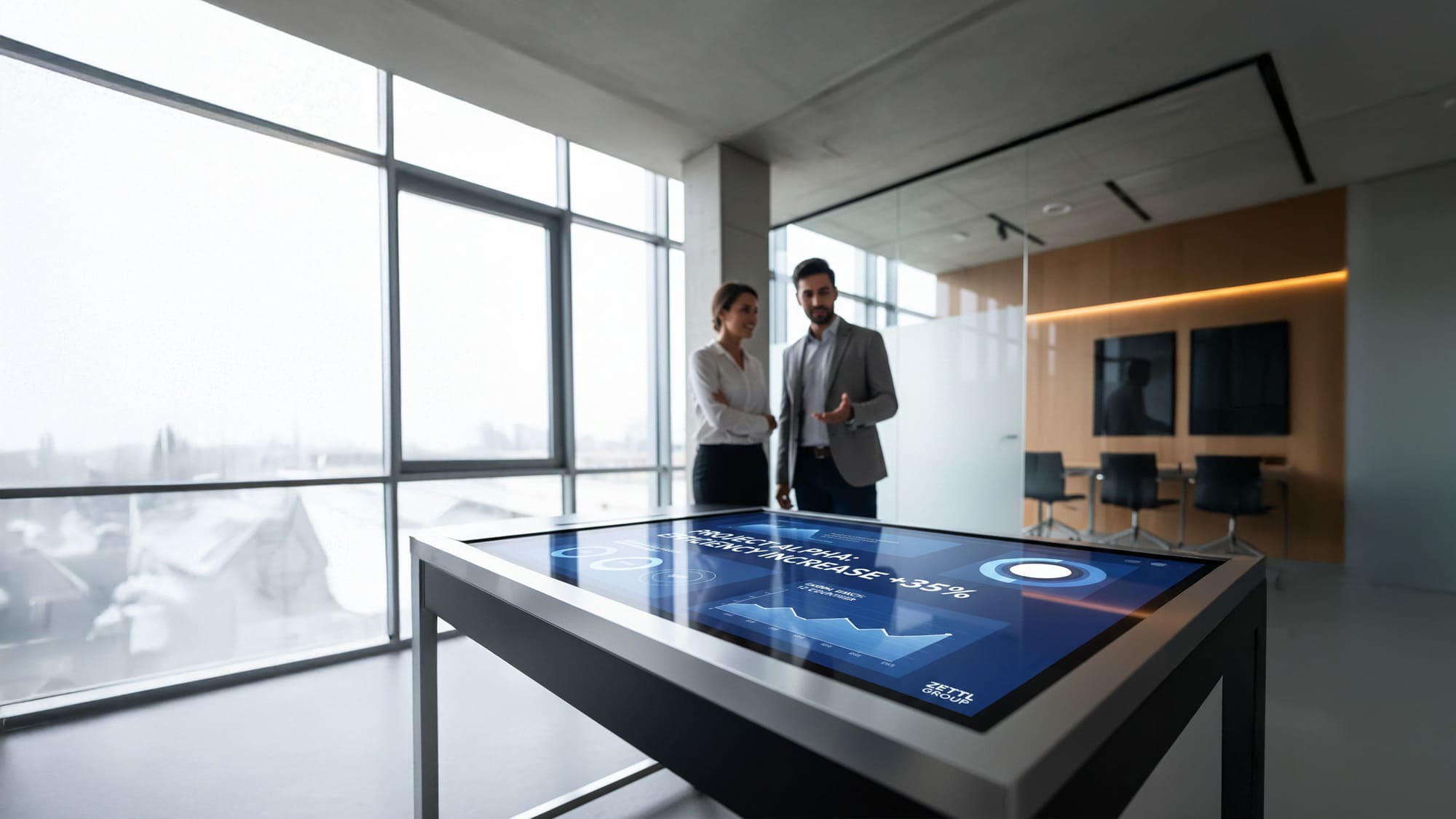 Zwei Geschäftsleute stehen in einem Büro und sehen sich eine Präsentation auf einem großen Bildschirm an.
