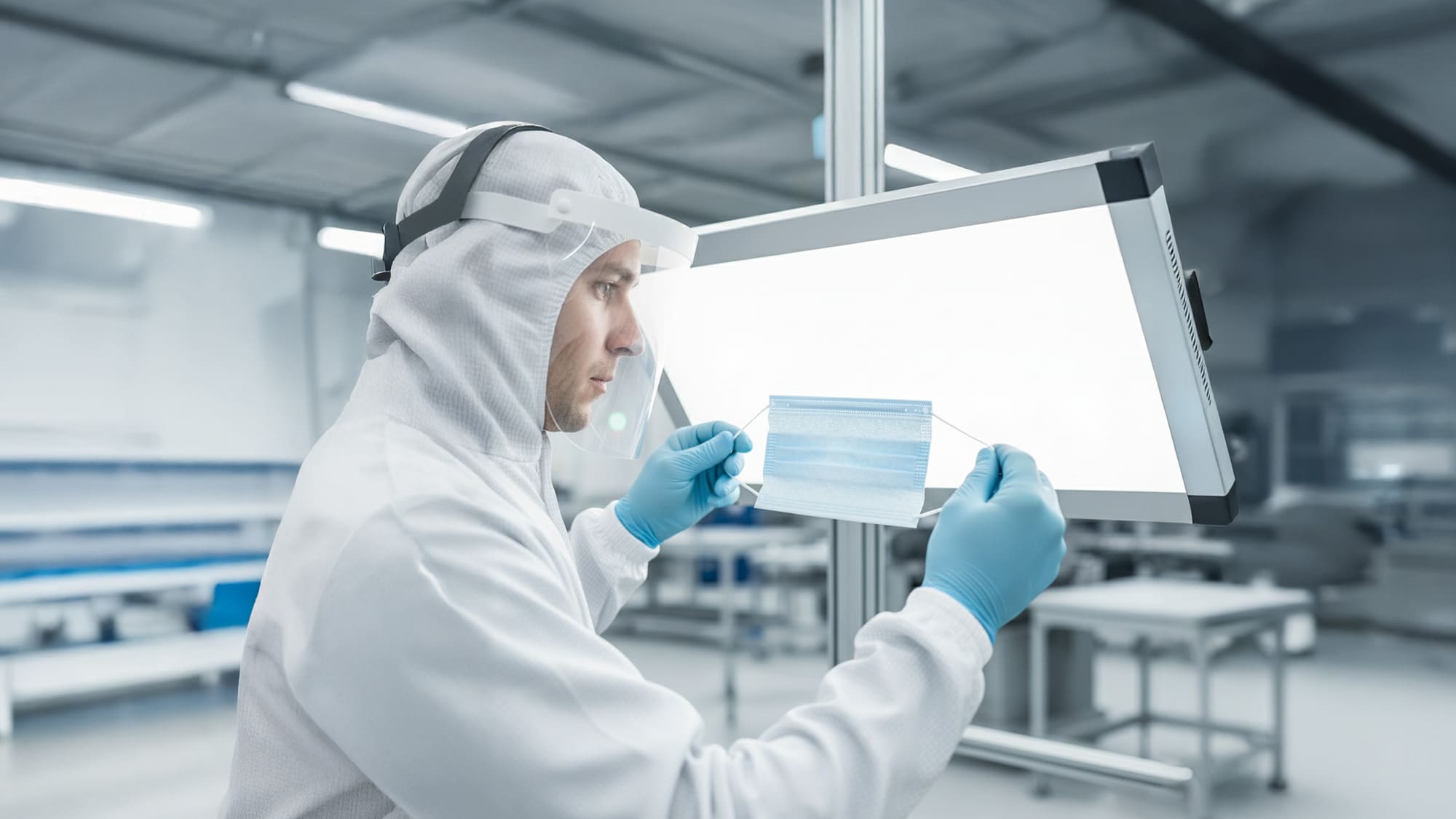 Wir richteten innerhalb kürzester Zeit einen Reinraum ein, stellten qualifiziertes Personal bereit und führten eine manuelle Sicht- und Funktionsprüfung nach kundenspezifischem Prüfplan durch. Jede Maske wurde einzeln bewertet und dokumentiert.