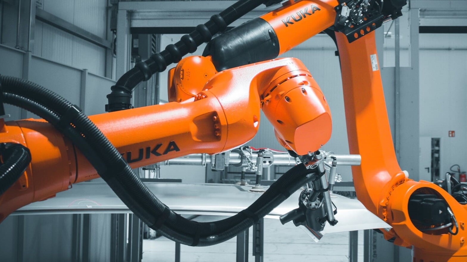 Industrieroboter von KUKA bei der Automatisierung von Fertigungsprozessen in einer modernen Produktionshalle. Der Roboterarm führt präzise Aufgaben an einem Werkstück aus.